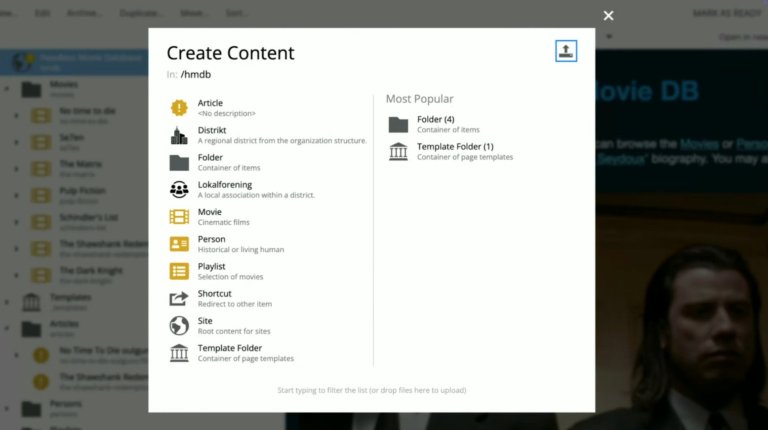 Når du skal opprette nytt innhold, er dialogboksen nå strippet for støy. Fokus ligger kun på det du skal lage der og da, med en tydeligere visning av hvor i strukturen innholdet plasseres. Opplasting av filer er flyttet til en egen fane, noe som gjør funksjonen mer synlig for nye brukere.